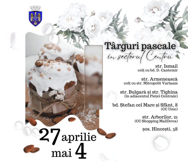 Pretura sectorului Centru invită locuitorii și oaspeții capitalei la Târgurile de Paști ce vor avea loc în mai multe locații din sector în perioada 27 aprilie- 4 mai. Ediția 2024 reunește producători locali care vor oferi produse specifice de Paști, savuroase bunătăţi tradiţionale, pască şi cozonaci, coşuri şi ornamente, dar şi multe idei de cadouri…