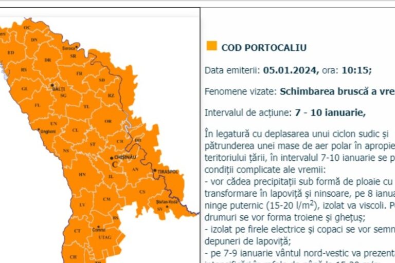Pretura sectorului Centru atenționează cetățenii în contextul avertismentelor de schimbare bruscă a vremii în perioada 7-10 ianuarie 2024 şi emitere a codului portocaliu de cădere a precipitațiilor abundente. Serviciile municipale…
