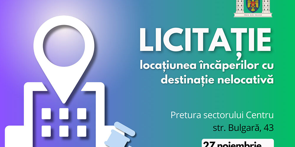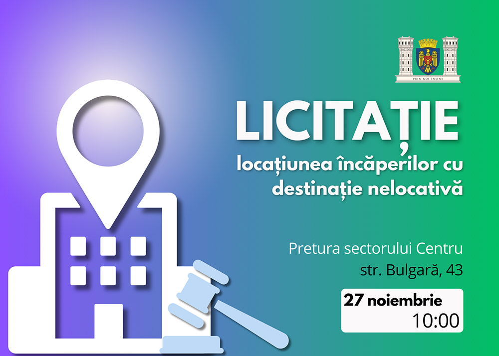 Primăria Municipiului Chișinău informează că pe data pe 27 noiembrie 2024, ora 10:00, în Sala de ședințe a Preturii sectorului Centru, str. Bulgară, 43, va avea loc licitația pentru obținerea dreptului de locațiune a încăperilor cu altă destinație decât cea locativă, proprietatea Municipiului Chișinău.