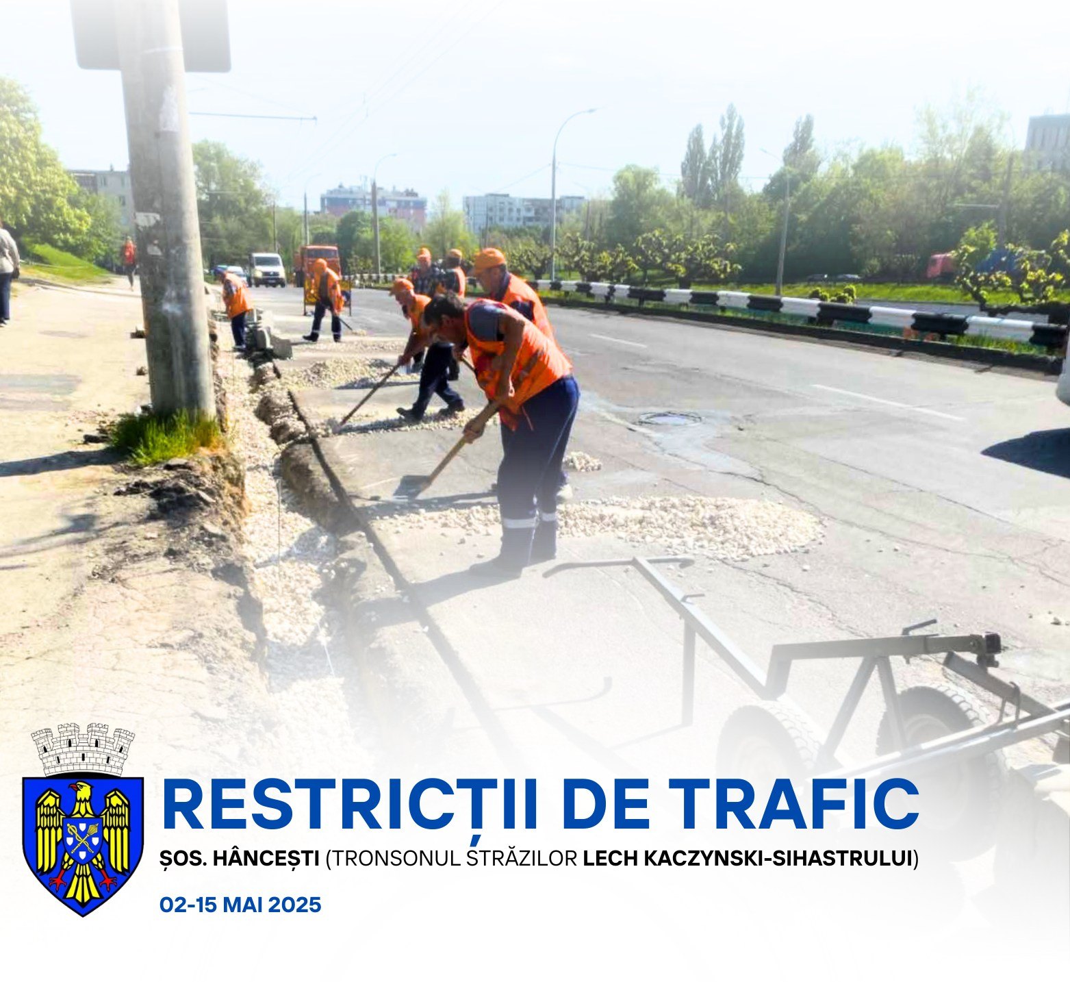 În perioada: 02-15 mai 2025, va fi suspendat parțial (pe benzi) traficul rutier pe șos. Hâncești, tronsonul cuprins între străzile Lech Kaczynski și Sihastrului.