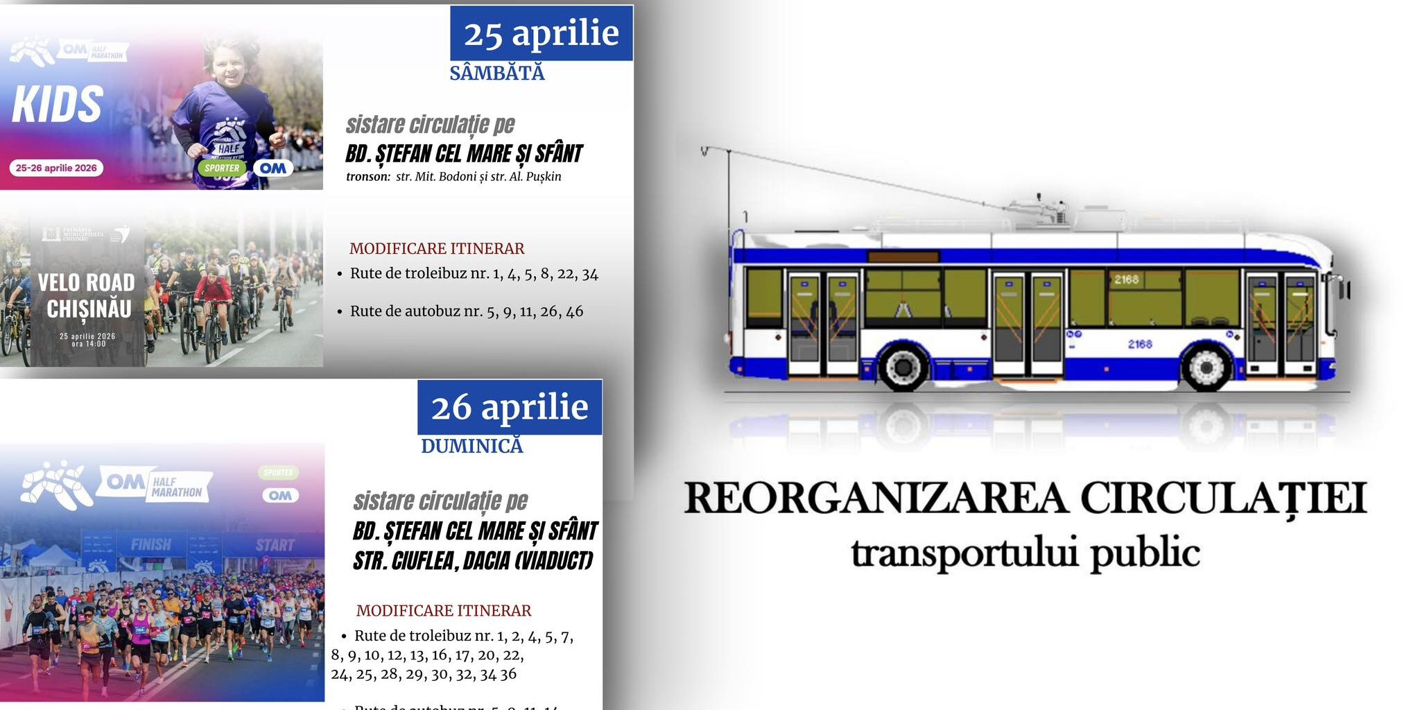 Primăria municipiului Chișinău informează că, în contextul desfășurării evenimentului Chișinău Half Marathon 2026, în zilele de 25 și 26 aprilie, circulația transportului public va fi reorganizată temporar, iar unele rute vor circula pe itinerare modificate.