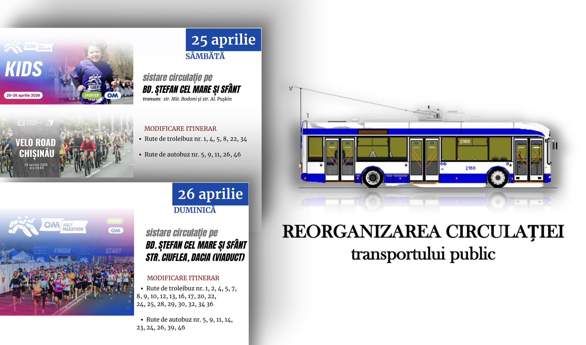Pe 26 aprilie 2026, va fi sistată circulația pe bd. Ștefan cel Mare și Sfânt, tronsonul cuprins între străzile str. Toma Ciorbă și str. Ciuflea, str. Ciuflea – bd. Dacia (viaduct, direcția de deplasare spre centrul urbei), cu redirecționări la următoarele rute: